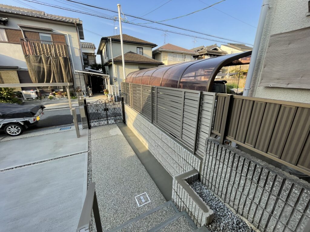 東大阪市N様邸リフォーム外構工事、コア抜き、フェンス取付、掘削、土間打設、仕上げ、砂利敷き工事を行いました。