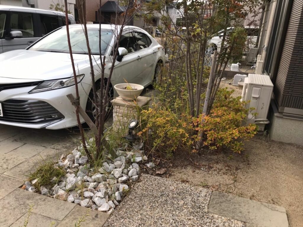 S様邸リフォーム外構工事、伐採、抜根、掘削、石ライン工事を行いました。施工前 施工後 S様ありがとうございました。